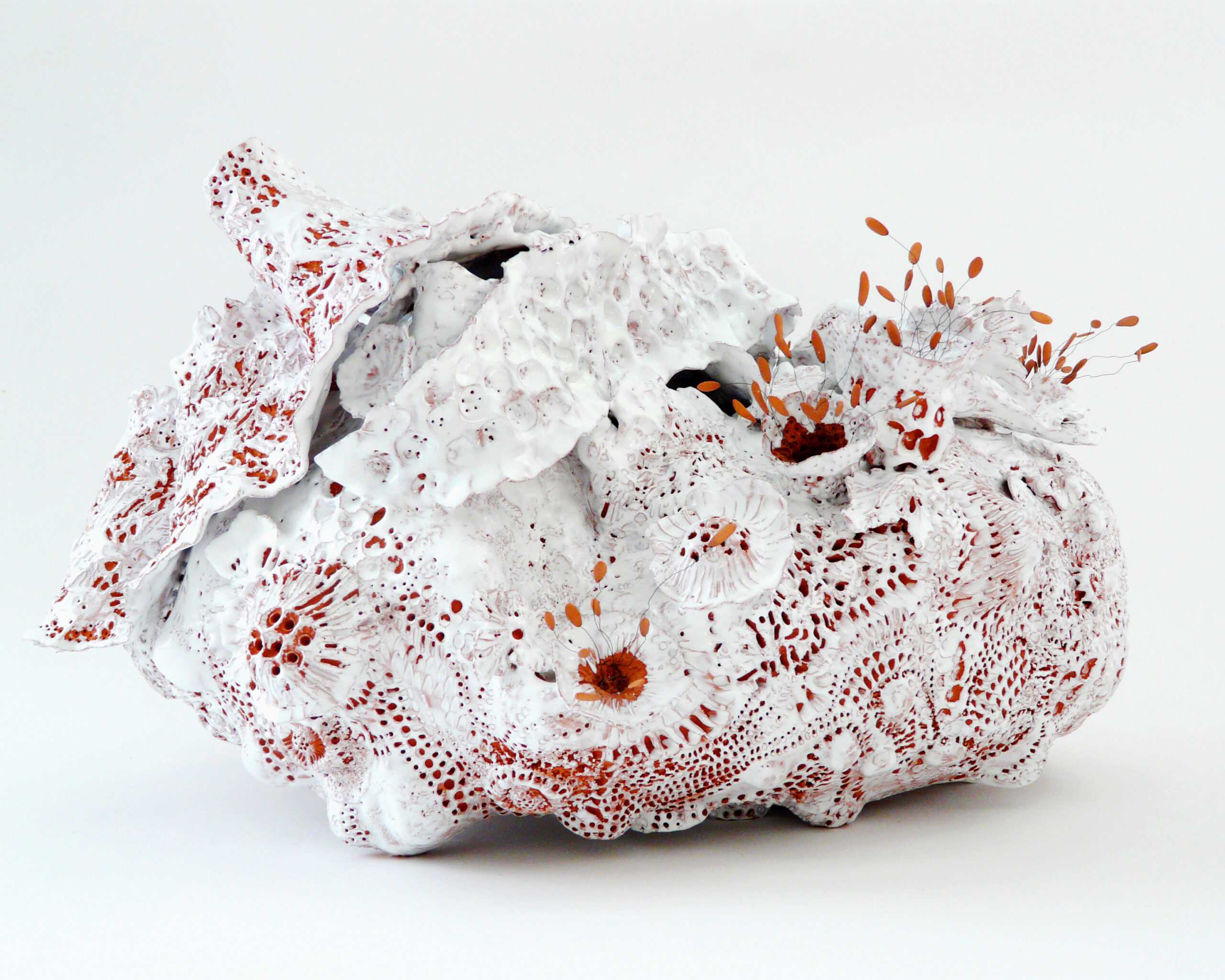 Sculpture céramique, "Les Bouquet d'Âmes Sœurs", allégorie de la nature, biodiversité, la nature, protégeons la nature, la nature est si belle, créations de Florence Lemiegre, artiste femme, sculptrice céramiste, faïence terre rouge de Normandie, biennale de Montmartre 2025, Villa Radet, , la Cité internationale des arts de Montmartre, Paris, Florence Lemiegre artiste invitée