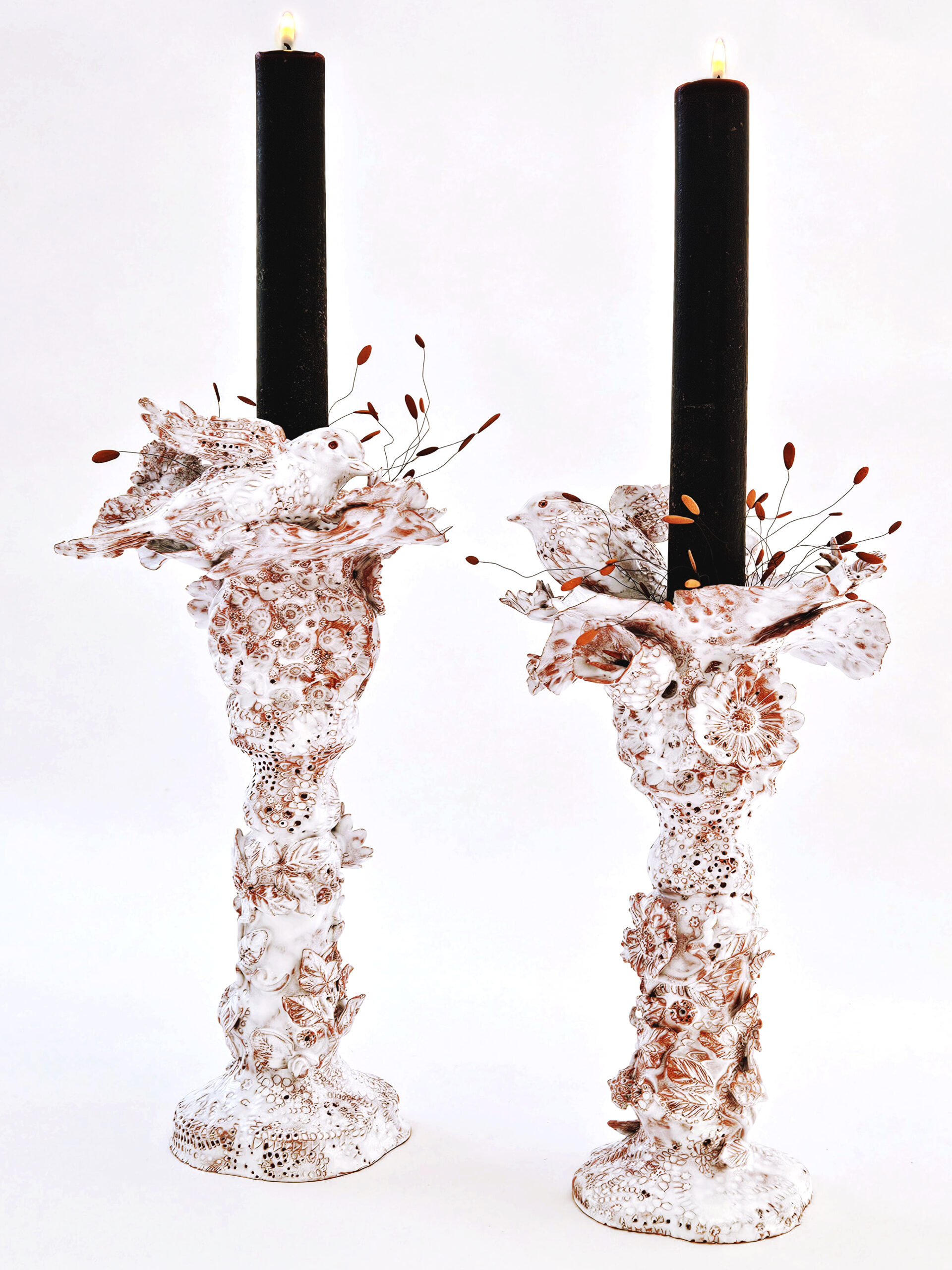 Chandeliers, bougeoirs en terre faïence rouge de Normandie. Oiseaux blancs, vibration, respiration, chant d’oiseaux, pistils, vent, poésie