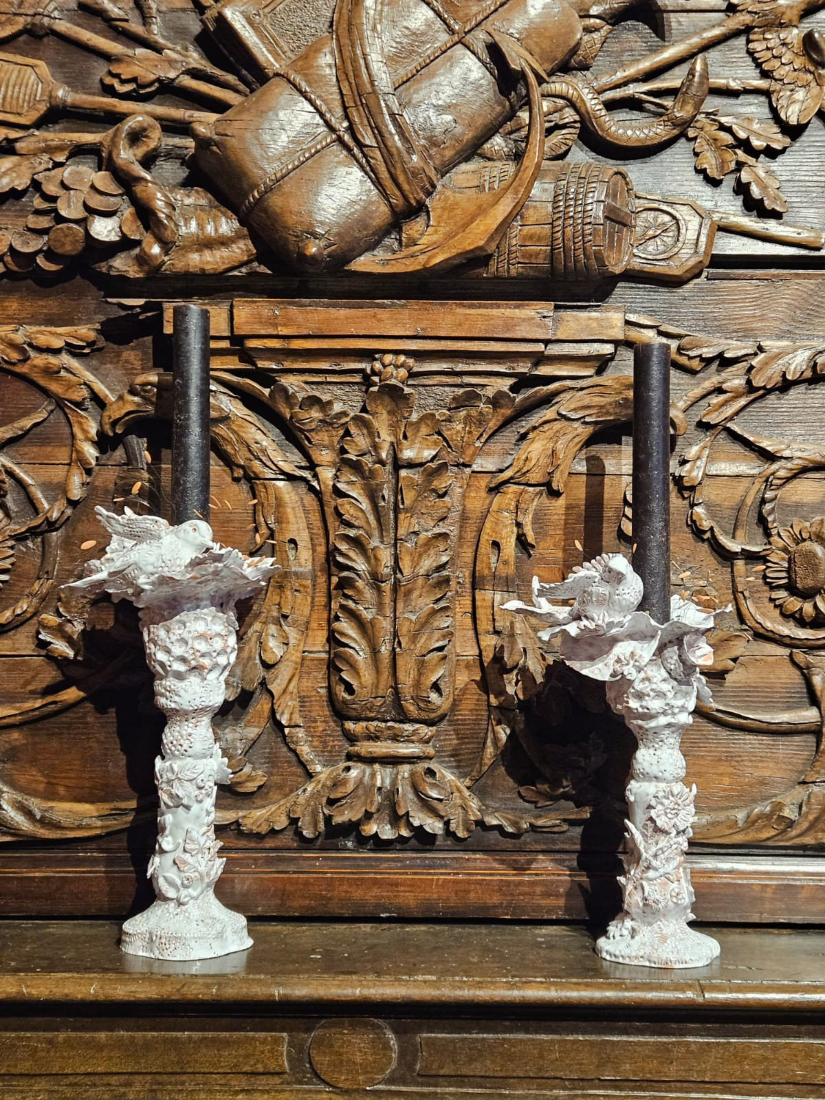 Chandeliers, bougeoirs en terre faïence rouge de Normandie. Oiseaux blancs, vibration, respiration, chant d’oiseaux, pistils, vent, poésie
